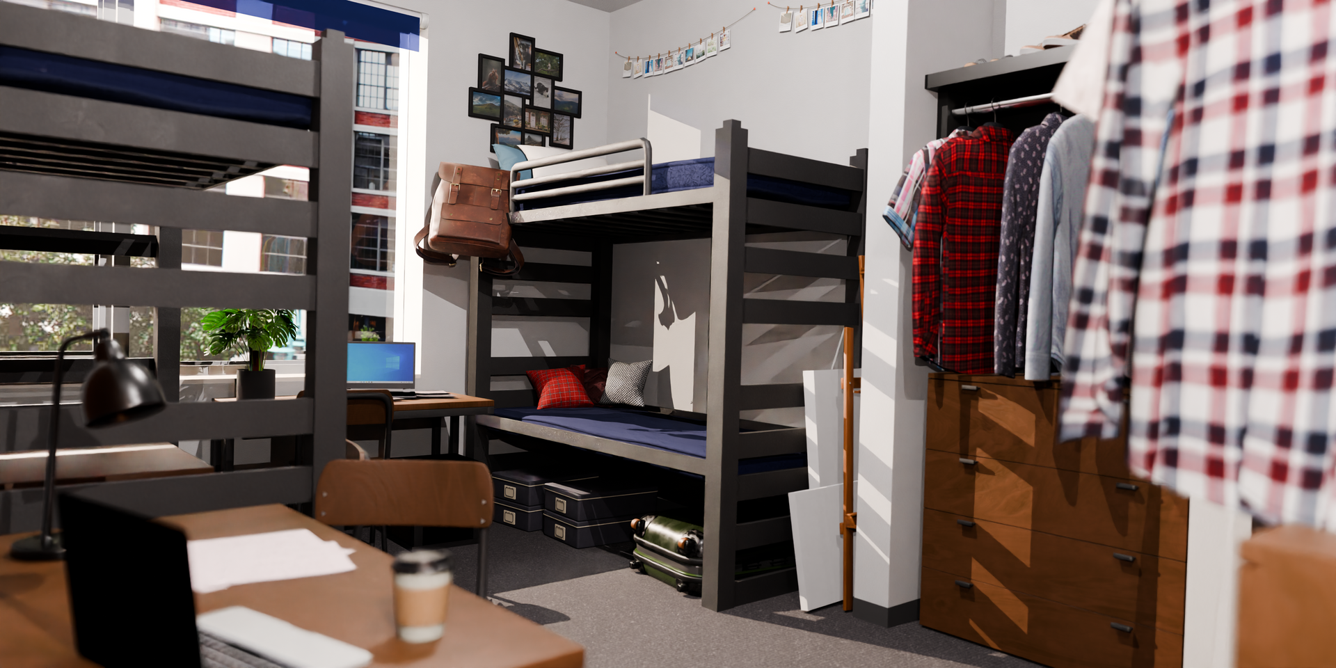 Units at Two50Two are designed to comfortably accommodate five students with two to three students sharing a bedroom. Units are furnished with a full-size couch, chair or love seat, end table, coffee table in the living room and include a flat screen LED TV and a technology package including Wi-Fi, and HDMI wall connection. Each kitchen is equipped with a refrigerator, stove/oven, microwave, and dishwasher along with an island and bar stools. Bedrooms are furnished with dressers, nightstands, desks and desk chairs, and twin XL beds.